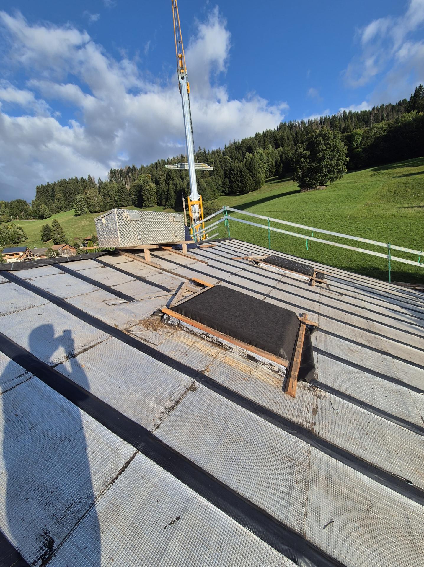 L’intervention a débuté par la dépose complète du tavaillon, suivie d’une reprise d’étanchéité et afin d'assurer une imperméabilité parfaite. La nouvelle couverture bac acier laqué gris offre une excellente résistance à la neige et à la corrosion. Les travaux comprenaient également le changement des Vélux, la réfection des chéneaux et descentes d’eau en cuivre, ainsi que la pose des bandes de rives pour une finition parfaite.